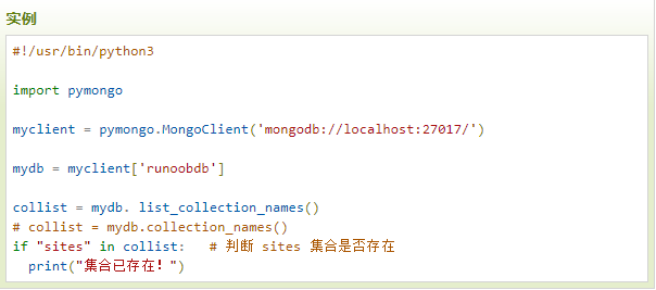 我们可以读取 MongoDB 数据库中的所有集合,并判断指定的集合是否存在: