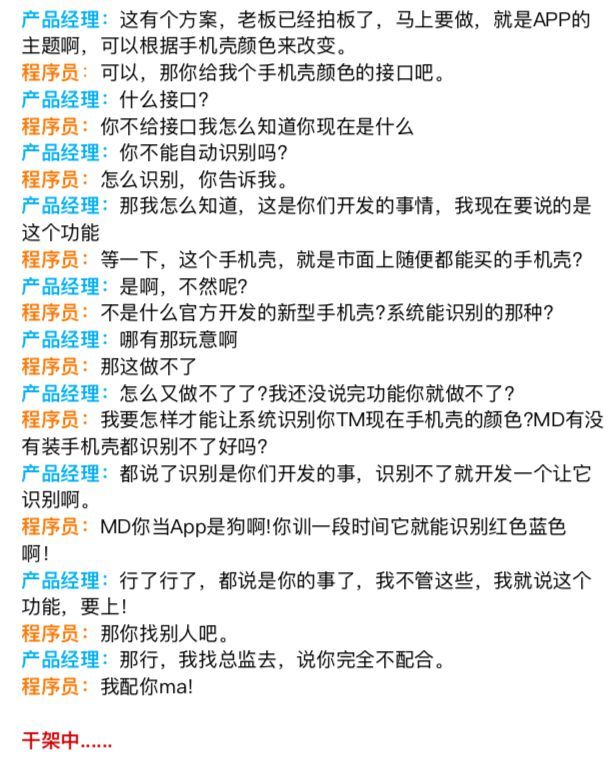 历史上出现的有关软件工程有趣故事并不多,我只能在此写一个前不久发生的事情,即”产品经理和程序员打架“事件。该事件于此链接中有详细描述,下图是事情经过的精华加工版。