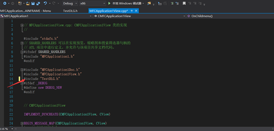 接下来,给跳转后的cpp文件加上“TestDLG.h”头文件(头文件名字=你的弹出框类名.h):
