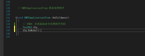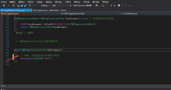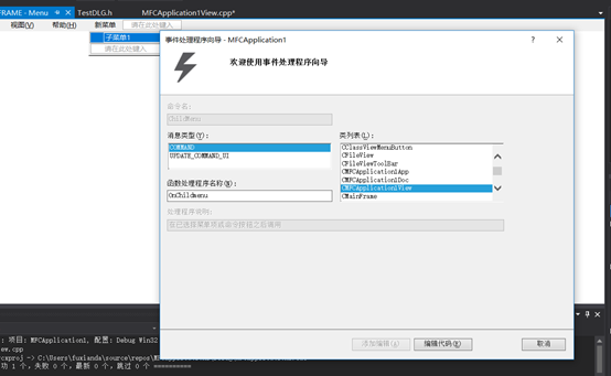 点击进入资源视图->Menu->IDR_MAINFRAME中,找到之前创建的子菜单,右键子菜单->添加事件处理程序->CXXXView,点击编辑代码。