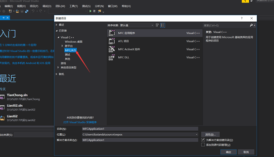 这里使用的是VS2017。首先,打开VS2017,选择文件->新建->项目,然后选择Visual C++ -> MFC /ATL>MFC应用程序 ,如下图所示: