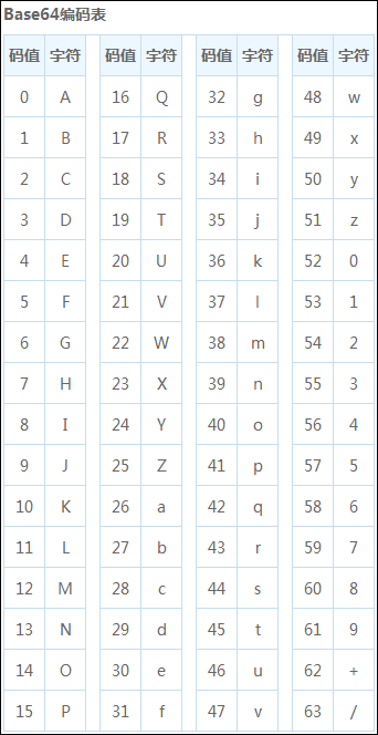 Base64编码是把每3个8位字节(3*8=24)转成4个6位字节(4*6=24),且在每个6位字节前补两个0,重新形成8位一个字节的形式,这样总的长度还是相同的,并且保证最高位不是1(即不是负数)。