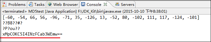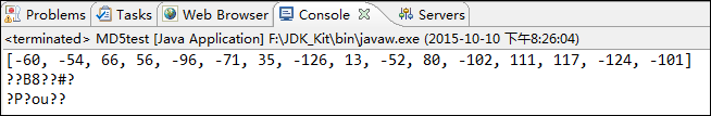 注意,经过md5后的字符数组中含有负数元素,因此如果将这个字符数组进行转换成字符串,查询GB2312或者UTF-8都是不合适的会出现乱码例如: