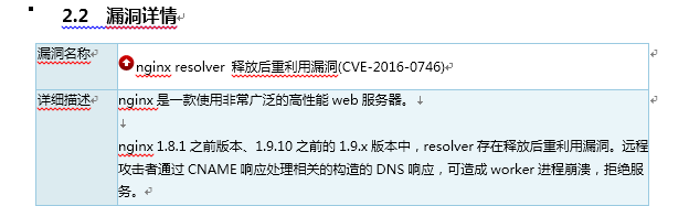 因为本人碰见过自己线上业务使用检测软件对web URL进行检测的时候,提示存在安全隐患,并且详情为“空指针间接引用漏洞出现个数超出,resolver存在释放后重利用漏洞。远程攻击者通过CNAME响应处理相关的构造的DNS响应,可造成worker进程崩溃,拒绝服务”具体截图如下: