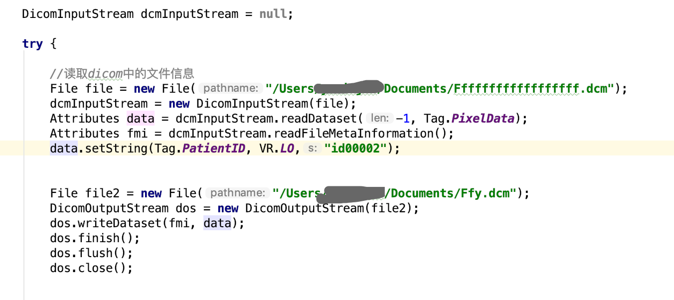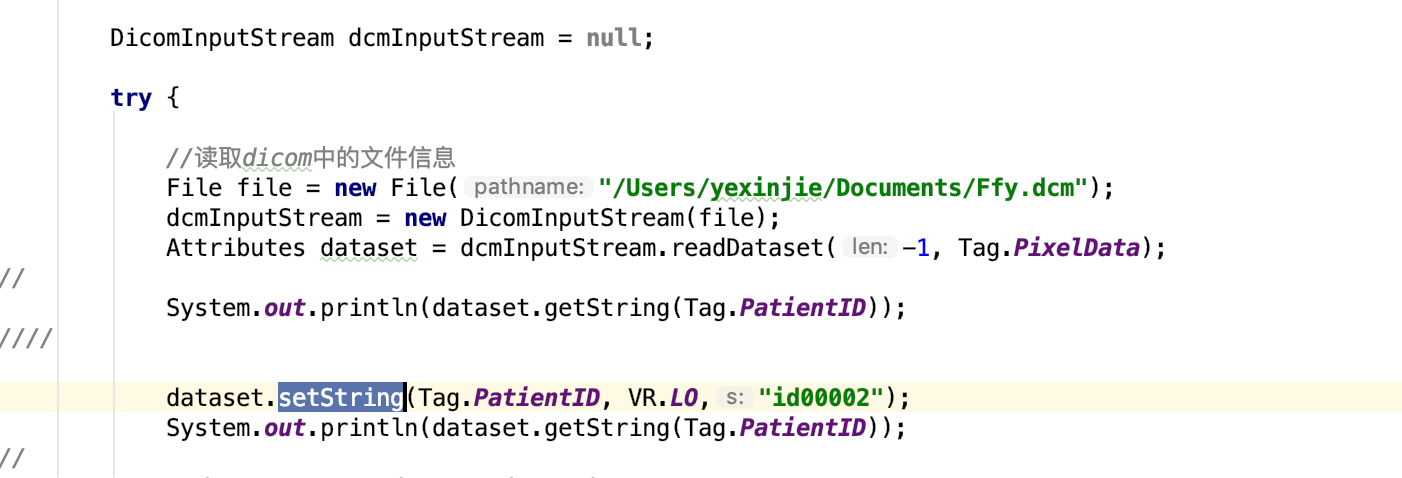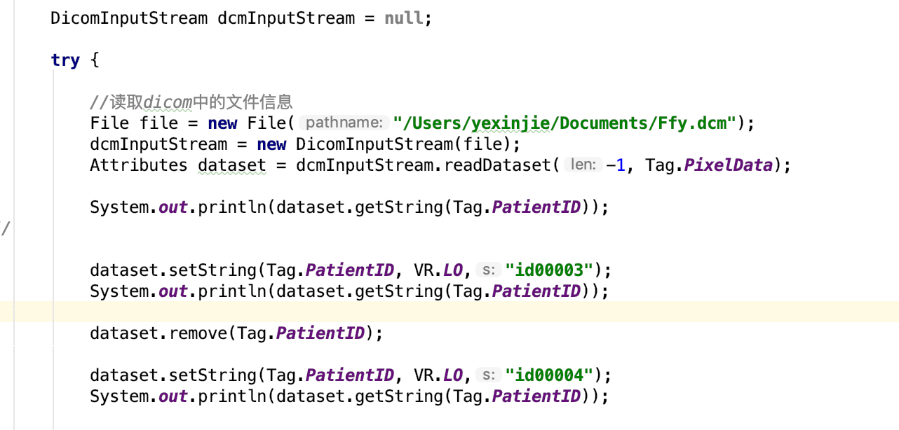 为了使用这个工具,我们要先去网上下载几个dicom文件来使用,我们先写一个小demo来看看,这里我们读取我已经放在电脑里的一个dicom文件,然后使用dicomImputStream来读取一个文件,获取这个文件的tag集合Attributes,然后我们读取期中的PatientId