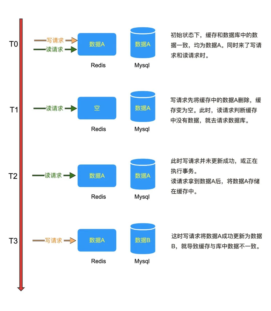 如图中所示,刚开始时(初始),数据库和缓存中的数据是一致的,但是在写请求过来后,数据库更新成功,而缓存删除失败。这就导致数据库中的数据是最新的,但缓存中却依然存着旧数据。