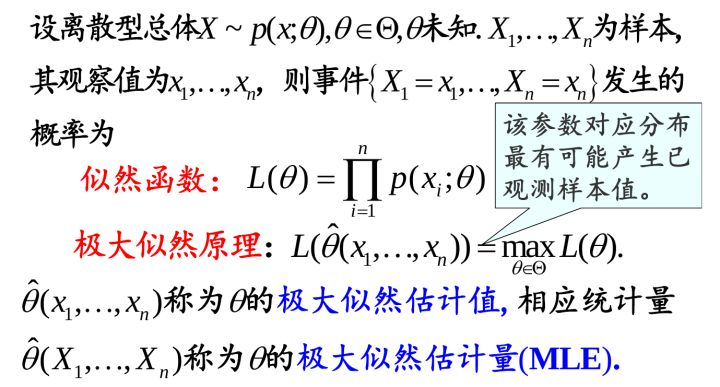上面有定义和例子,应该比较好理解了,我们要注意的是离散型和联系型的区别。这个知识点特别重要,机器学习很多时候,应该说是非常多时候,都是在求参调参。怎么求参,很多时候用就是极大似然估计!
