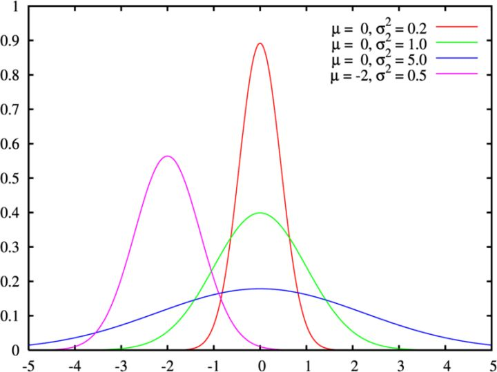 高斯分布又叫正态分布,其曲线呈钟型,两头低,中间高,左右对称因其曲线呈钟形,如下图所示的这个不同期望和方差的分布图: