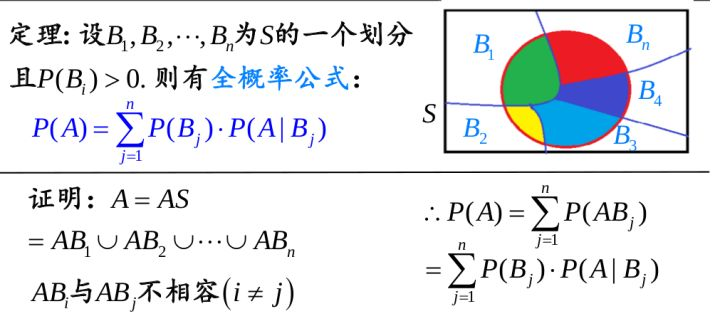 全概率公式:公式表示若事件B1,B2,…,Bn构成一个完备事件组且都有正概率,则对任意一个事件A都有公式成立。注意:Bi是两两互斥的,如下图: