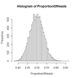 本图描绘了多次抛掷硬币实验中出现正面的平均比率,每次实验均抛掷了大量硬币。我们就可以发现其是符合高斯分布的。