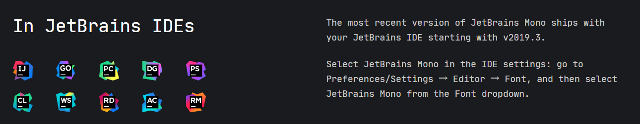并且,从 2019.3 版本开始,JetBrains Mono 字体将随 JetBrains 系列 IDEs 一起提供。
