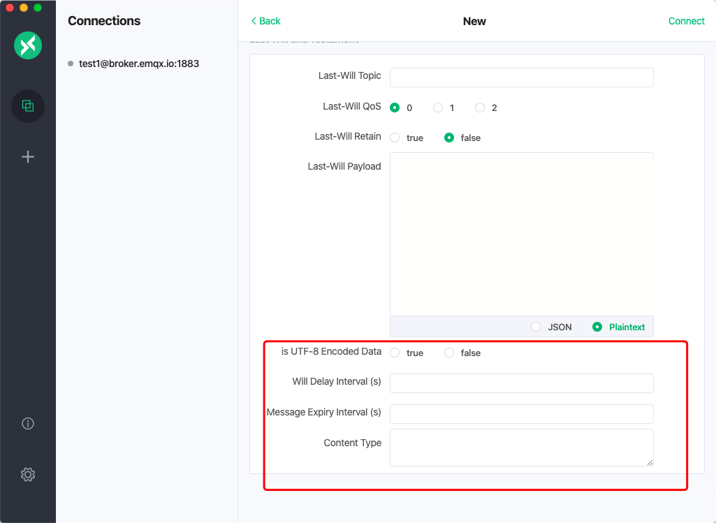 新版本还对 MQTT 5.0 中的一些功能特性进行了支持。创建连接时,选择 MQTT 的版本为 5.0,便可以对遗嘱消息中的