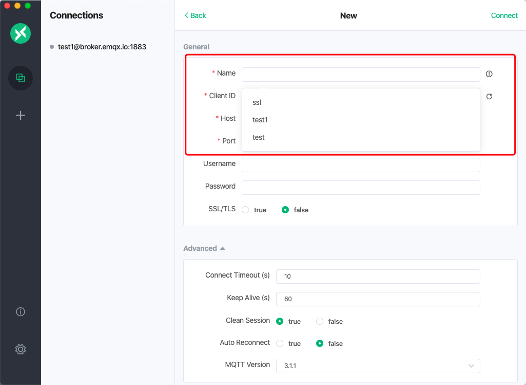 对于每次创建新的连接客户端时,很多连接配置都会相同,因此在该版本中对其进行了优化,每当创建不同配置的连接时,都会对其进行存储。当用户下次需要创建相同配置连接时,便可以在连接名称一栏中,快速选择已经创建过的连接配置,从而达到快速创建连接的目的。