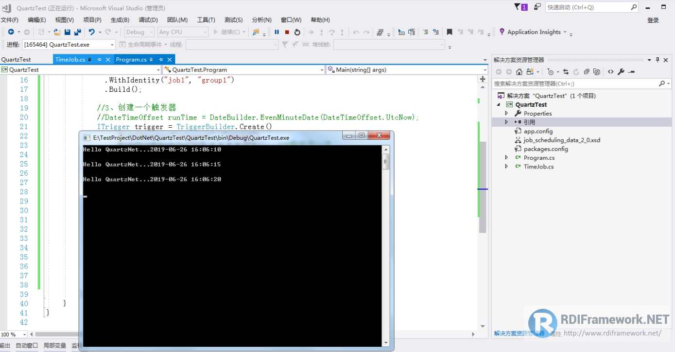 Quartz.NET允许开发人员根据时间间隔(或天)来调度作业。它实现了作业和触发器的多对多关系,还能把多个作业与不同的触发器关联。整合了 Quartz.NET的应用程序可以重用来自不同事件的作业,还可以为一个事件组合多个作业。