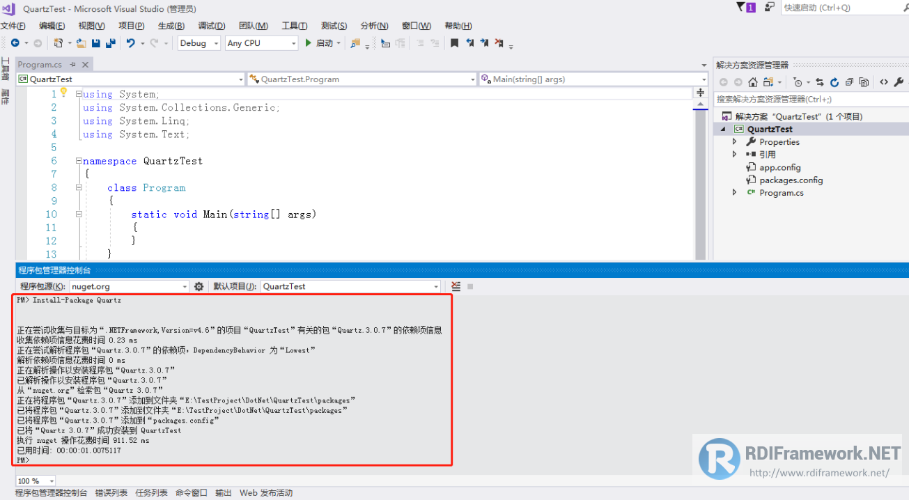 引入框架的方法非常简单你可以直接用nuget管理包也可以在项目中添加引用。为了满足不同客户的需求,本文以最简单的方式来讲解在Visual Studio中如何正确使用Quartz.NET。