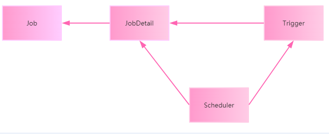 Job 为作业的接口,JobDetail 用来描述 Job 的实现类及其它相关的静态信息;Trigger 作为作业的定时管理工具,一个 Trigger 只能对应一个作业实例,而一个作业实例可对应多个 Trigger ;Scheduler 做为定时任务容器,它包含了所有触发器和作业,每个 Scheduler 都存有 JobDetail 和 Trigger 的注册,一个 Scheduler 中可以注册多个 JobDetail 和多个 Trigger 。