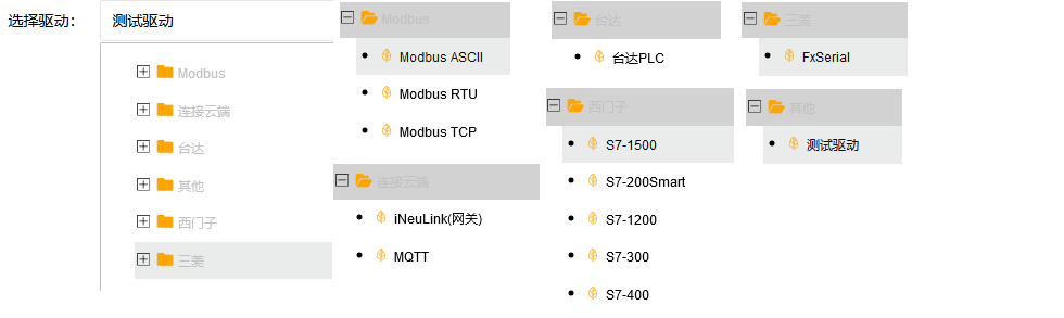 (1) 设备容器增加设备驱动,包括:西门子(S7-200smart、S7-300、S7-400、S7-1200、S7-1500)、三菱(FxSerial)、MQTT协议等。