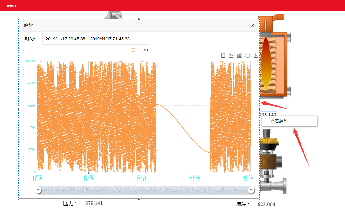 (8) 组态建模开发好的视图,可以右键单击数值文本框,查看数据曲线趋势。
