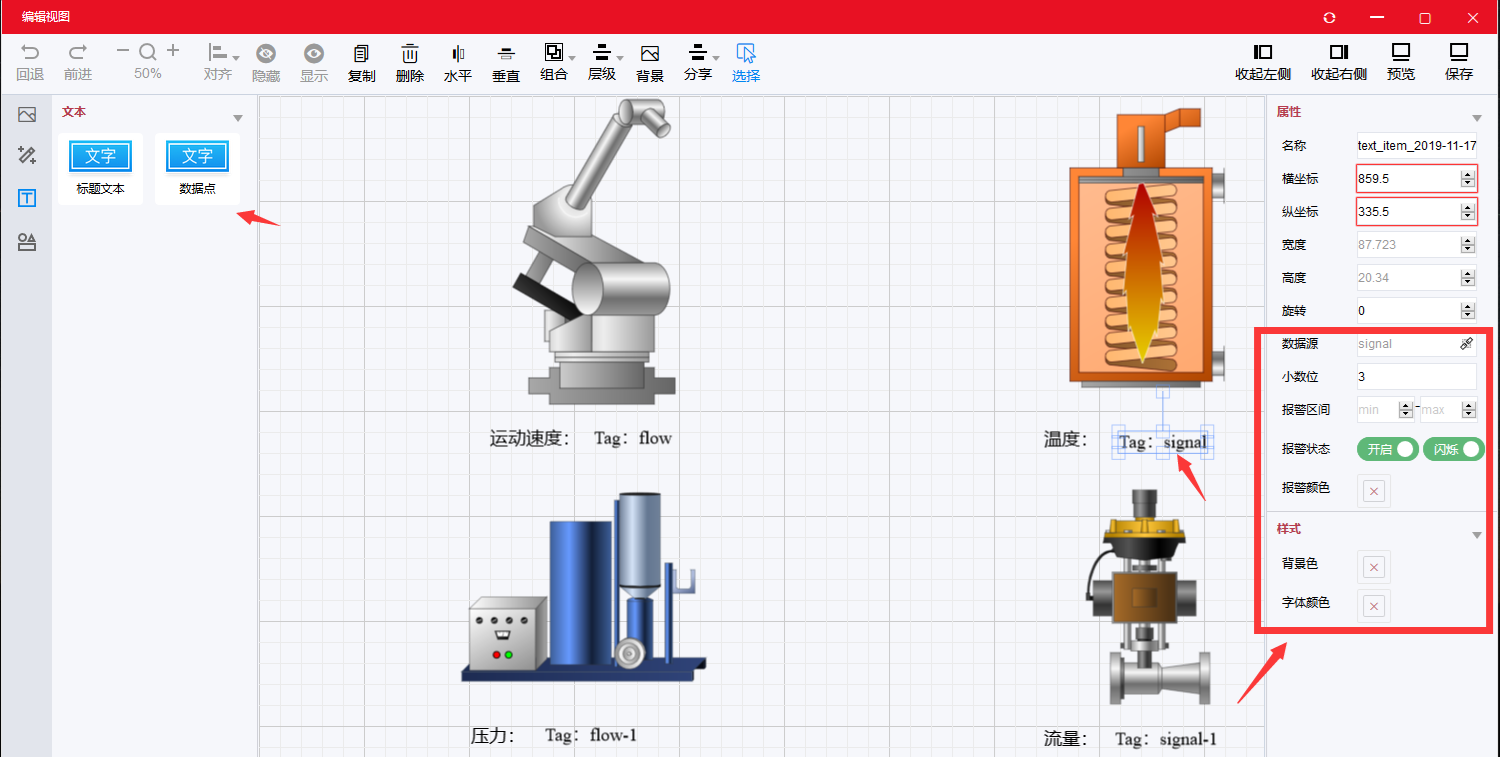 (2)编辑数据的文本框,可以设置背景和字体颜色、报警运作、保留小数位数等,更具有交互感。