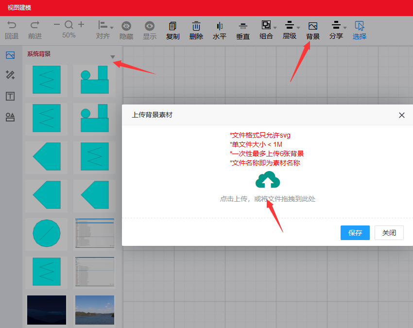 (1)增加编辑区域设置背景功能,主要用于开发数据大屏展示的效果,可以上传多个背景图元,并且作为一个独立的图元,随时可以更换背景。