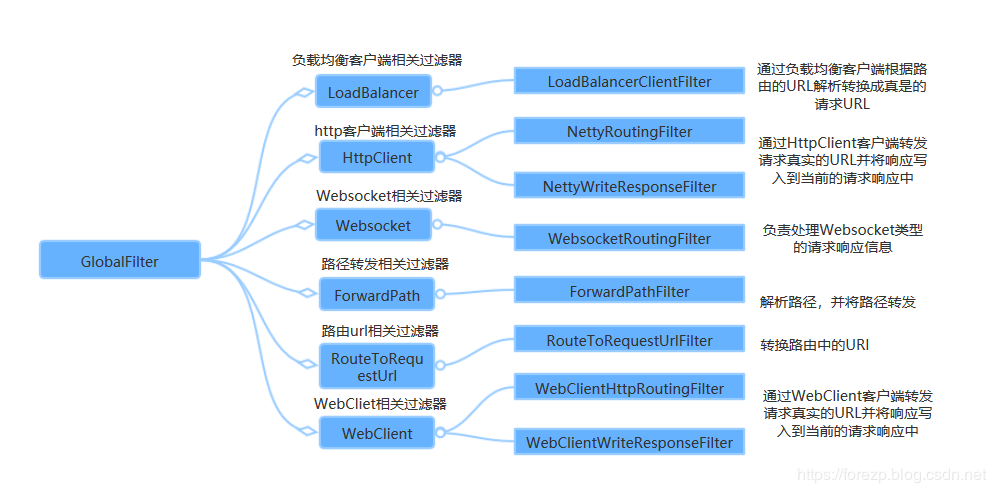 3.2、GlobalFilter : 全局过滤器,不需要在配置文件中配置,作用在所有的路由上,最终通过GatewayFilterAdapter包装成GatewayFilterChain可识别的过滤器,它为请求业务以及路由的URI转换为真实业务服务的请求地址的核心过滤器,不需要配置,系统初始化时加载,并作用在每个路由上。