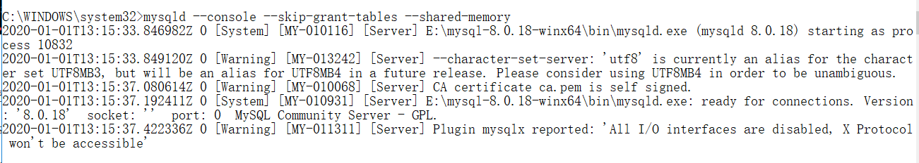 在cmd中执行 mysqld --console --skip-grant-tables --shared-memory