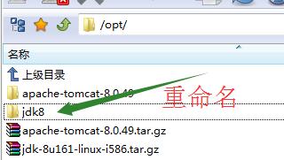 把下载的安装文件jdk-8u161-linux-i586.tar.gz和apache-tomcat-8.0.49.tar.gz用FlashFXP上传到/opt/目录下,上传完成后,在Xshell软件中用命令进行解压,解压完成后我们把jdk的那个文件夹名字改成jdk8(在FlashFXP软件对着文件夹右键重命名就可以改)。