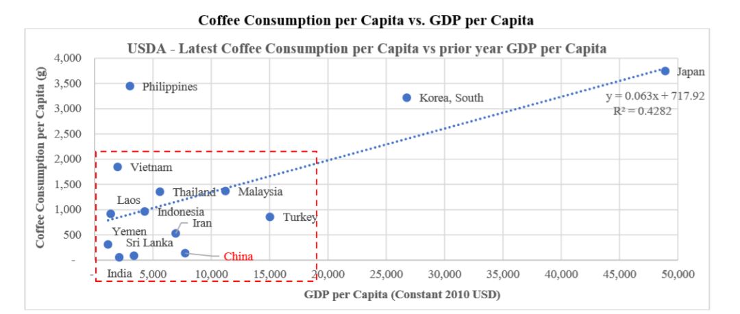 先不谈这个图的回归曲线R平方拟合系数只有0.4282,图片本身除了呈现一下中国咖啡消费“低迷”没有任何其他意义,单说其分析中据此就断定瑞幸的咖啡前景不乐观,显得太武断。