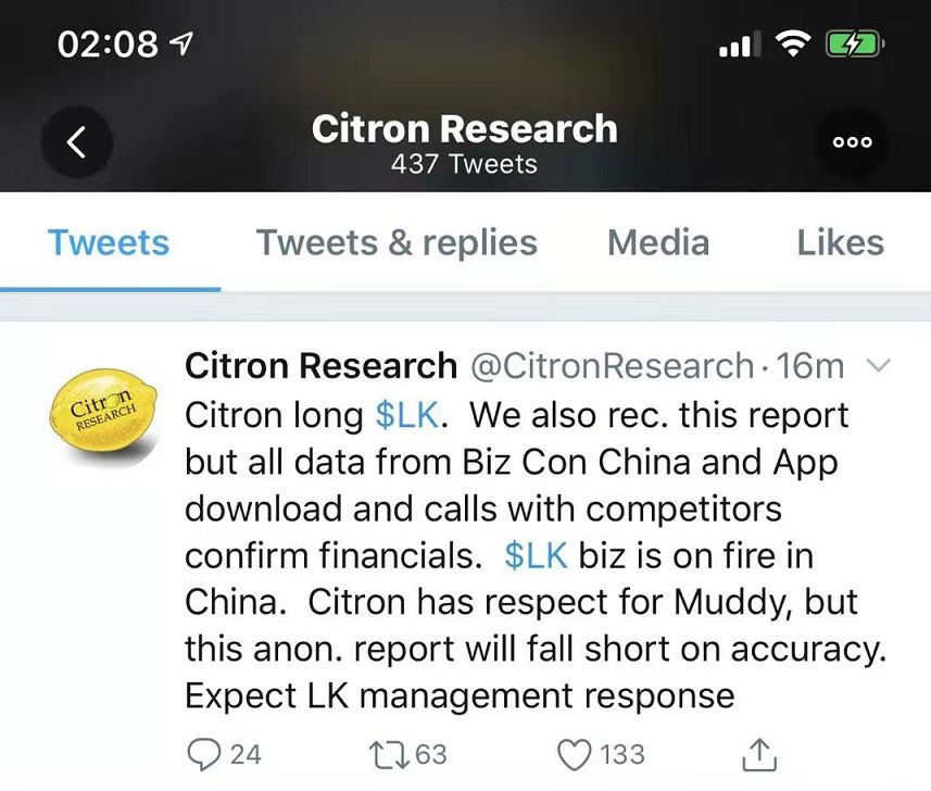 不过,与浑水一个锅里抢食,甚至被认为做空姿态更猛、言辞更激烈的Citron(常被翻译成“香橼”公司,是另一家喜好狙击中国概念股的民间调查机构),却对这份报告提出了相反的看法。在Twitter上,Citron表示,“Citron通过商业数据、应用下载以及访谈竞争对手都确认了瑞幸的数据,证明瑞幸在中国业务爆发。Cintron尊重浑水,但这个匿名报告不准确”: