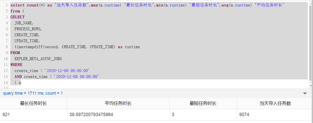 一些依赖数据洞察(类似DeepInsight)的业务,他们本身也是平台方,上面每天都大量的导入任务,且这些任务需要在规定的时间内导入完成,有些甚至配置了基线要求,不仅要求所有任务在规定的时间点导入完成,还要求每个任务在规定的时间点内完成。这在原来AnalyticDB 2.0上(依靠跑MapReduce任务)是不可想象的,然而在AnalyticDB 3.0上可以轻松地跑完。AnalyticDB 3.0的任务导入做到更加轻量和实时。以11月8日的导入任务为例,9074个任务最长的只需要921秒,最短的3秒完成,平均时长39秒完成。