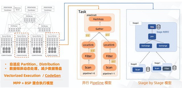 - batch:采用Stage by stage执行模型,中间结果、算子状态可以落盘,适用于高吞吐,延迟要求低的查询,具备更低的计算成本