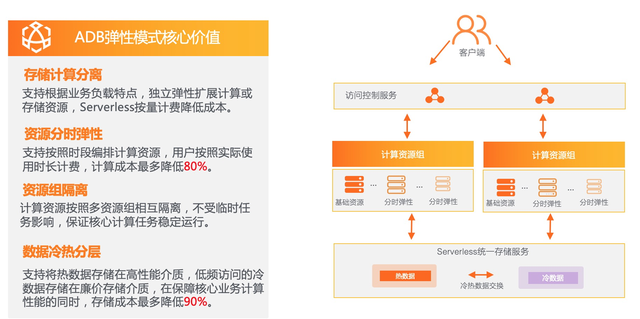全面拥抱云平台的弹性能力,AnalyticDB主推新弹性模式的产品形态,后端采用了计算存储分离的新架构,提供统一的服务化Serverless存储层,计算层可以独立弹性扩展,同时兼具了预留模式的性能。通过计算与存储的解耦,用户可以较为灵活地单独对计算资源、存储容量进行扩缩,更加合理控制总成本。针对计算资源的扩缩,不再需要数据的搬迁,具备更极致的弹性体验。