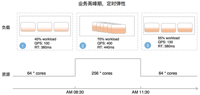 一般情况下,业务具备非常明显的波峰波谷,低峰期资源往往处于闲置阶段。AnalyticDB分时弹性功能可以让这类用户定制弹性计划(每天定时、每周定时),在业务高峰期来临之前自动进行扩容满足业务流量。定时的弹性计划即满足了业务流量高峰的需求,又降低了AnalyticDB使用成本。结合资源组功能,用户甚至可以让某个资源组在低峰期时0节点,成本极低。