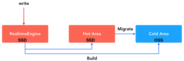 AnalyticDB数据写入时,数据会首先进入热空间SSD上,当热存储数据积累到一定程度或者用户指定的冷表策略时会自动调度后台的Build任务,把数据迁移到冷存储空间。对于用户来说,写入和查询完全是透明的。