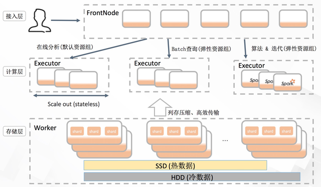 在存储计算分离的架构下,AnalyticDB的计算能力也得到了极大的释放,可以支持非常丰富和强大的混合计算负载能力,在经典的在线(online)/交互式(interactive)查询执行模式之外,也支持了离线/批处理(batch)查询执行模式,同时可以通过集成开源的计算引擎(比如Spark)来支持迭代计算和机器学习等复杂计算能力。