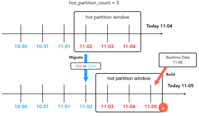 - 在Build调度的同时,根据冷热策略的滑动窗口,自动把历史分区从热区迁移到冷区。下图中,定义的热分区个数为3,在11月4日,热分区为11-04、11-03日、11-02日共3个,在11月5日,写入了新的11-05的数据,根据滑动窗口,最新的热分区为11-05、11-04、11-03三个,因此在Build时,会触发热分区到冷分区的迁移,11-02分区自动迁移到冷区。