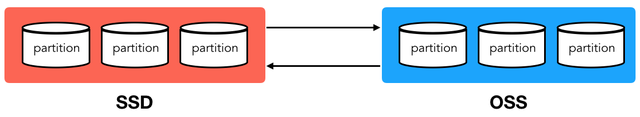 冷热分离的第一步是确定冷热的粒度和边界。AnalyticDB冷热分离技术延用了现有的二级分区机制,即以分区为冷热存储的基本单位。热分区存储在节点SSD盘上,获得最好的性能,冷分区存储在OSS上,以达到最低的存储成本。