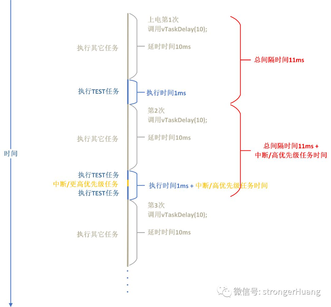 TEST任务每次系统延时都是从调用延时函数vTaskDelay()开始算起的,所以叫相对延时。