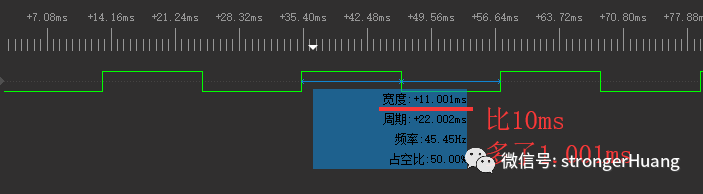 结果为:相对延时的周期为系统延时10ms + 执行任务1ms的时间,总共11ms时间。绝对延时的周期即为10ms时间.