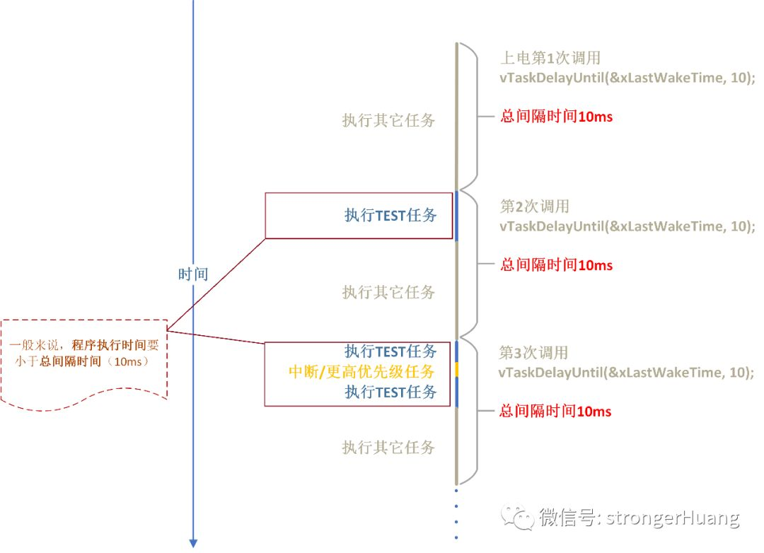 和上面相对延时程序执行图比较,可以看出,系统延时的时间包含了程序执行的时间。即时中途有中断,或更高优先级任务打断,不会影响下一次执行的时间(也就是这个周期不会变,当然,打断时间不能超过系统延时值)。