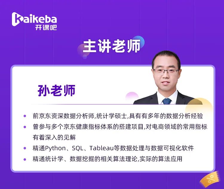 前京东资深数据分析师、统计学硕士,具有多年的数据分析经验。曾参与多个京东健康指标体系的搭建项目,对电商领域的常用指标有着深入的见解。精通Python、SQL、Tableau等数据处理与数据可视化软件。