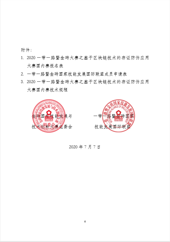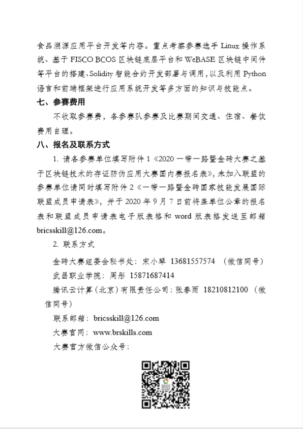 请各参赛单位填写附件1《2020一带一路暨金砖大赛之基于区块链技术的存证防伪应用大赛国内赛报名表》,未加入联盟的参赛单位请同时填写附件2《一带一路暨金砖国家技能发展国际联盟成员申请表》,并于2020年9月7日前将盖单位公章的报名表和联盟成员申请表电子版表格和word版表格发送至邮箱bricsskill@126.com。