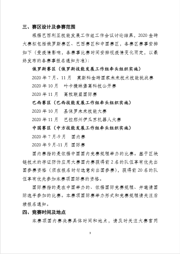 根据巴西利亚技能发展工作组工作会议讨论结果,2020金砖大赛拟包括俄罗斯赛区、巴西赛区和中国赛区,各赛区赛事安排如下(受疫情影响,各赛事比赛时间安排视疫情变化而定,以最终发布的各赛事报名通知为准):