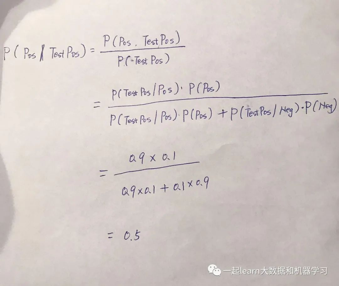 是不是有点surprise。对于发病率较低的疾病,比如说0.01,一样的准确度,测试出是阳性的结果,实际上是阳性的概率只有0.083.
