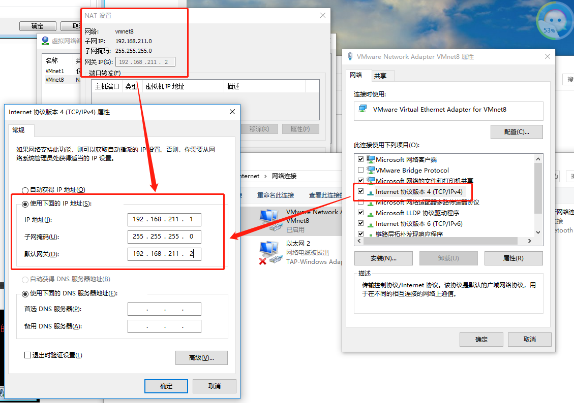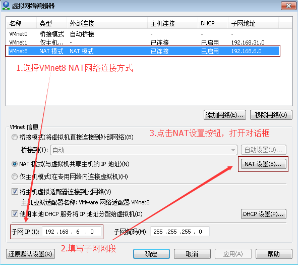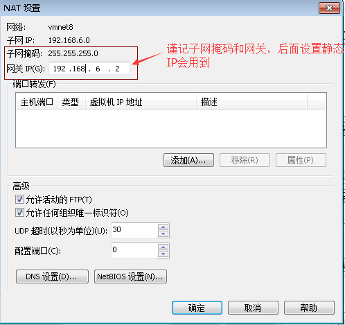 安装好虚拟后在菜单栏选择编辑→ 虚拟网络编辑器,打开虚拟网络编辑器对话框,选择Vmnet8 Net网络连接方式,随意设置子网IP,点击NAT设置页面,查看子网掩码和网关,后面修改静态IP会用到:
