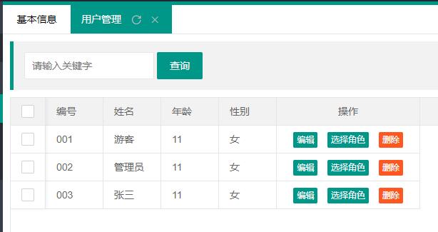 这里在用户页面点击编辑按钮时设置需要有id=002的角色,在点击选择角色按钮时需要有code=002的权限。