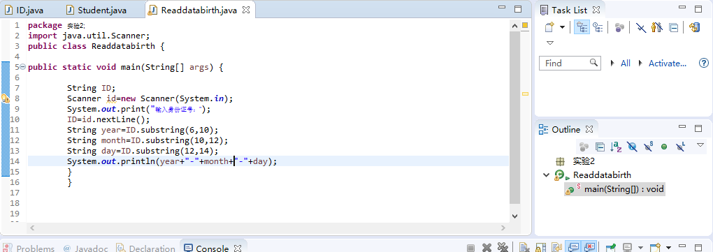 实验2:公民身份证号码按照GB11643—1999《公民身份证号码》国家标准编制,由18位数字组成:前6位为行政区划分代码,第7位至14位为出生日期码,第15位至17位为顺序码,第18位为校验码。从键盘输入1个身份证号,将身份证号的年月日抽取出来,按年-月-日格式输出。注意:输入使用Scanner类的nextLine()方法,以免出错。
