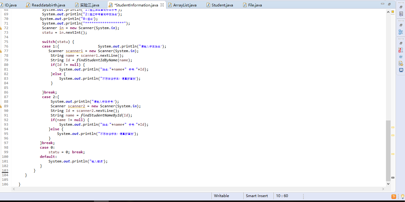 实验3:studentfile.txt文件内容是本班同学的学号与姓名,利用此文件编制一个程序,将studentfile.txt文件的信息读入到内存,并提供两类查询功能:(1)输入姓名查询学号;(2)输入学号查询姓名。要求程序具有友好人机交互界面。