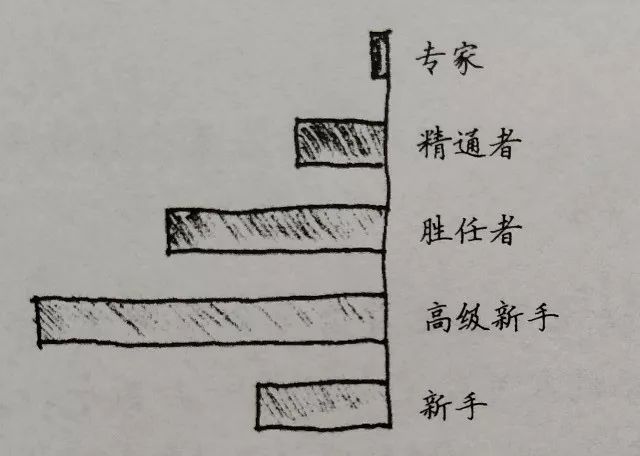 对某一项技能来讲,大部分的人都处于新手或高级新手这个层级,合计比例占到65~70% 。有大约 15% 的人是胜任者,大约10%的人是精通者,2~5%的人是专家。