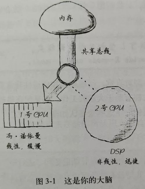 Andy Hunt 结合他对认知科学和神经系统科学的了解,拿大脑和我们熟悉的电脑做了一个类比:大脑的配置为双CPU,单主机总线设计。如下图所示: